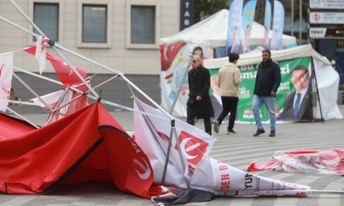Ayrıca, Bursa 15 Temmuz Demokrasi Meydanı’nda 31 Mart Yerel Seçimleri için çalışma yapan bazı siyasi parti stantlarının rüzgara dayanamayarak yerle bir oldu.