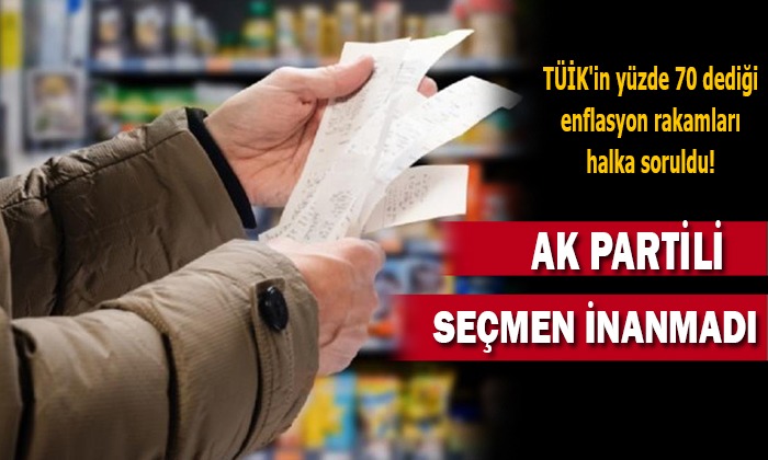 MetroPOLL Araştırma’nın yapmış olduğu çalışmaya göre Türkiye’de TÜİK’in yüzde 70 olarak açıkladığı yıllık enflasyon rakamlarına vatandaşın yüzde 73’ü inanmıyor. AK Partili seçmenin yüzde 58’i bu verilere inanırken, MHP’li seçmenin yüzde 50,6’sı resmi verilerin doğruluğunu kabul etmediğini dile getirdi. Muhalefet kanadından Saadet Partisi’ne oy verenlerin yüzde 36,7’si ise verilerin doğru olduğunu düşünüyor.