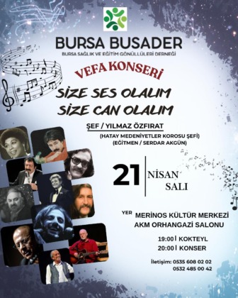 Bursa Sağlık ve Eğitim Gönüllüleri Derneği (Bursa BUSADER), toplumsal dayanışmanın en güzel örneklerinden birine imza atmaya hazırlanıyor. “Size Ses Olalım, Size Can Olalım” sloganıyla 21 Nisan’da Merinos AKKM’de düzenlenecek olan “Vefa Konseri”, Tip-1 diyabetlilerin insülin pompasına, işitme engelli çocukların ise cihazlarına kavuşmasını hedefliyor. Hatay Medeniyetler Korosu Şefi Yılmaz Özfırat’ın yönetiminde, BUSADER gönüllülerinden oluşan koronun sahne alacağı bu özel gecede, aramızdan ayrılan usta sanatçıların ölümsüz eserleri iyilik için seslendirilecek.