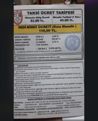 Bursa Şoförler ve Otomobilciler Esnaf Odası tarafından belirlenen yeni tarifede kısa mesafe olarak bilinen indi-bindi ücreti ise 150 TL’ye yükseltildi. Tarifeye göre 100 metre için ücret 4,50 TL olarak hesaplanırken, 1 saatlik zaman tarifesi 345 TL oldu. Dakika başına bekleme ücreti ise 5,75 TL olarak uygulanacak.