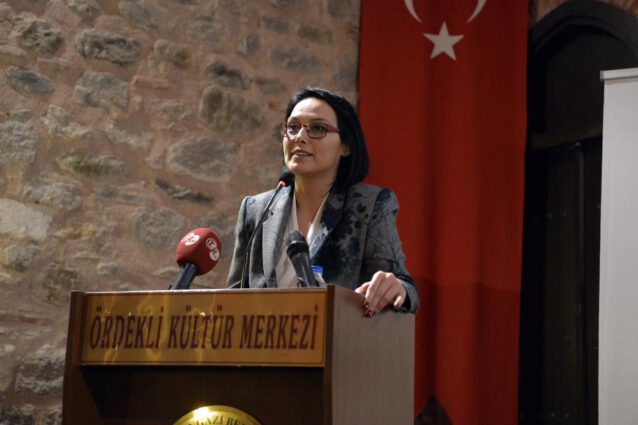 Söyleşi sonunda Osmangazi Belediyesi Kültür İşleri Müdürü Gülşah Cebelli Öncel, Doç. Dr. Hacer Karabağ’a hediye takdim etti.