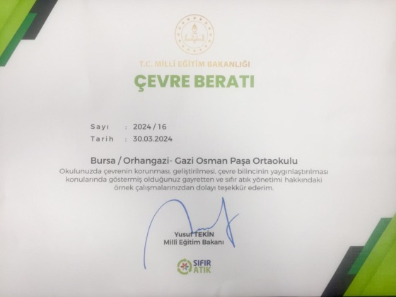 Sıfır Atık Yarışması “İyi Uygulama Yapan Okul” kategorisinde Gazi Osman Paşa Ortaokulu Türkiye 1. si olarak “Çevre Beratı” ödülü almaya hak kazandı. Çevre duyarlılığı ve Sıfır Atık projesi kapsamında gerçekleştirilen çalışmalar ile ilgili yapılan uygulamalar Milli Eğitim Bakanlığınca örnek uygulama olarak seçildi.
