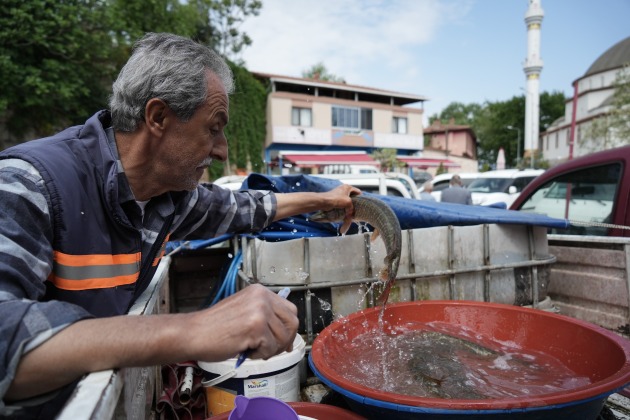 Bu sene balık fiyatlarının yüksek olduğunu belirten Hasan Dikmeoğlu, “Doğduğumdan beri balıkçıyım. Şimdi de esnaflık yapıyorum. Balığı köyde ve pazarda satıyorum. Turna, sazan, İsrail balığı ve arada yayın balığı çıkıyor. Uluabat Gölü’nde çok güzel balıklarımız var. Turnalar bu yıl ortalama 200 TL’den satılıyor” şeklinde konuştu.